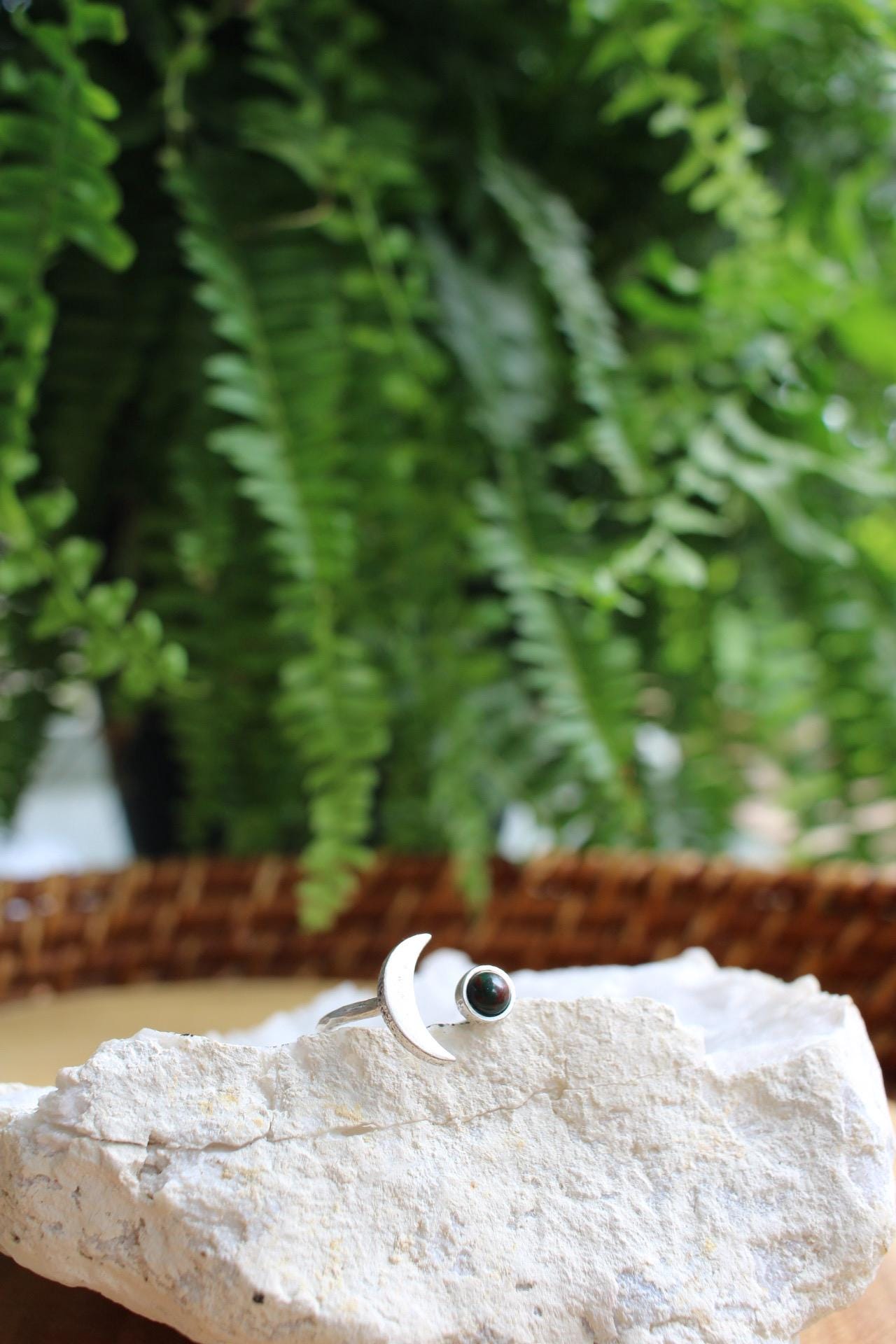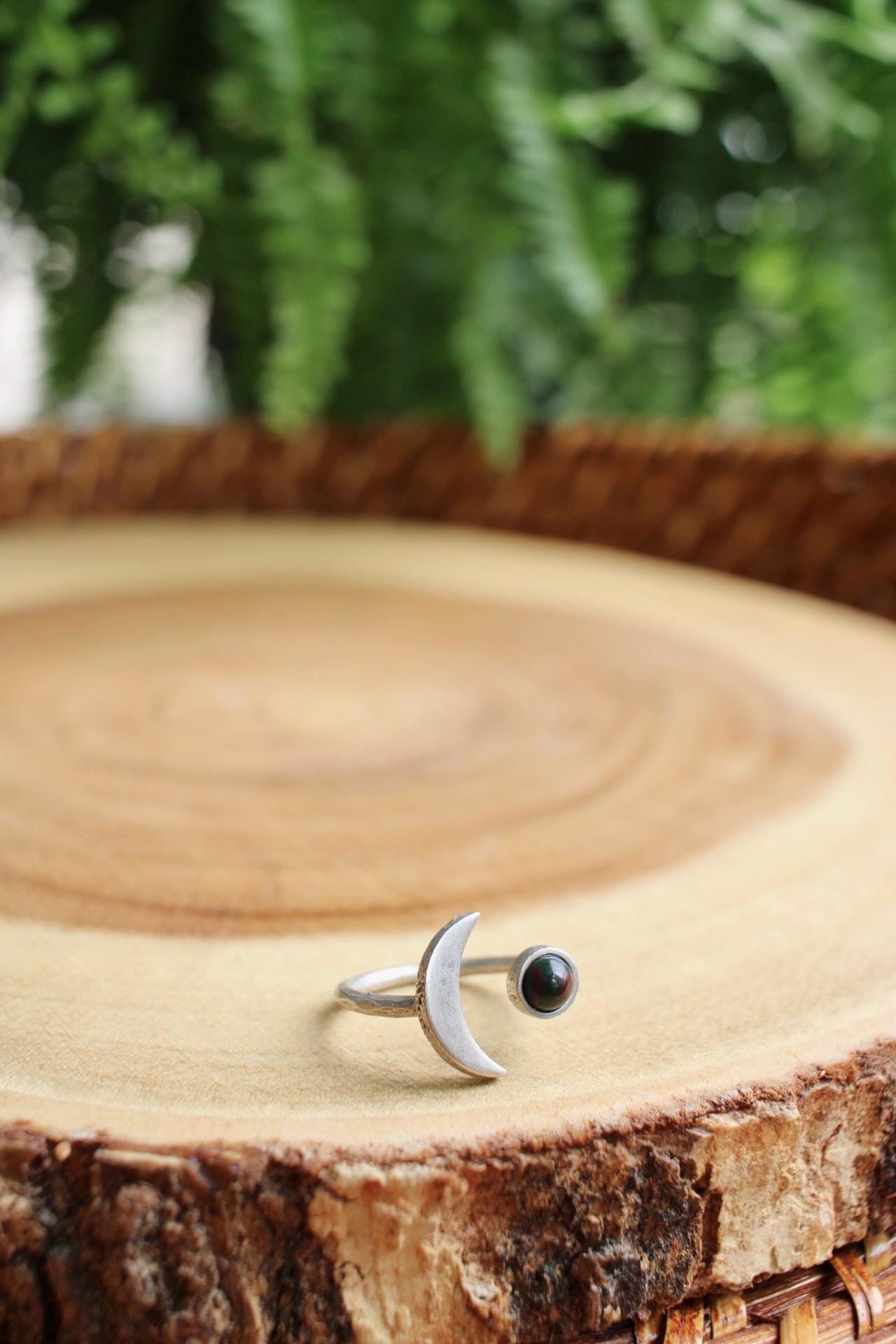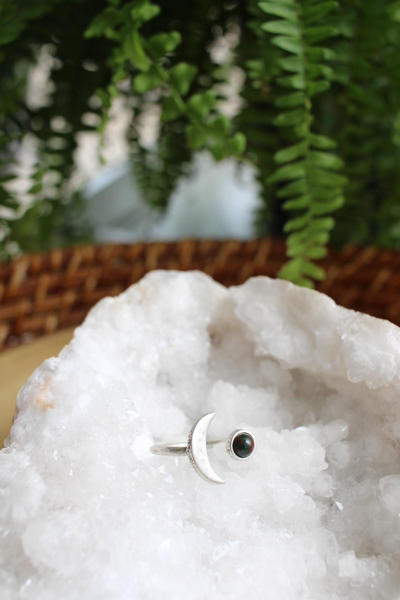 This celestial ring features a crescent moon and a bloodstone cabochon all attached to an adjustable silver plated hammered ring.