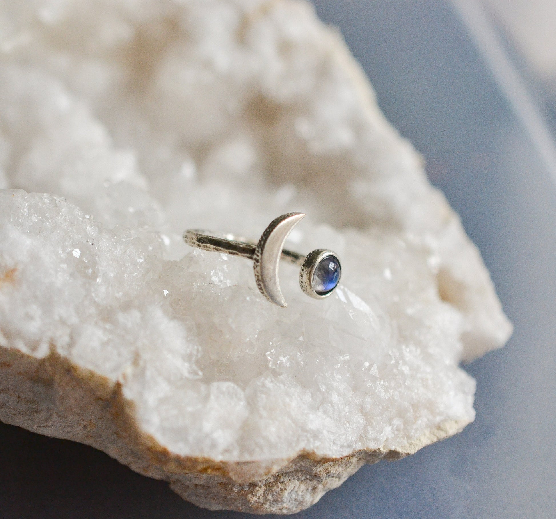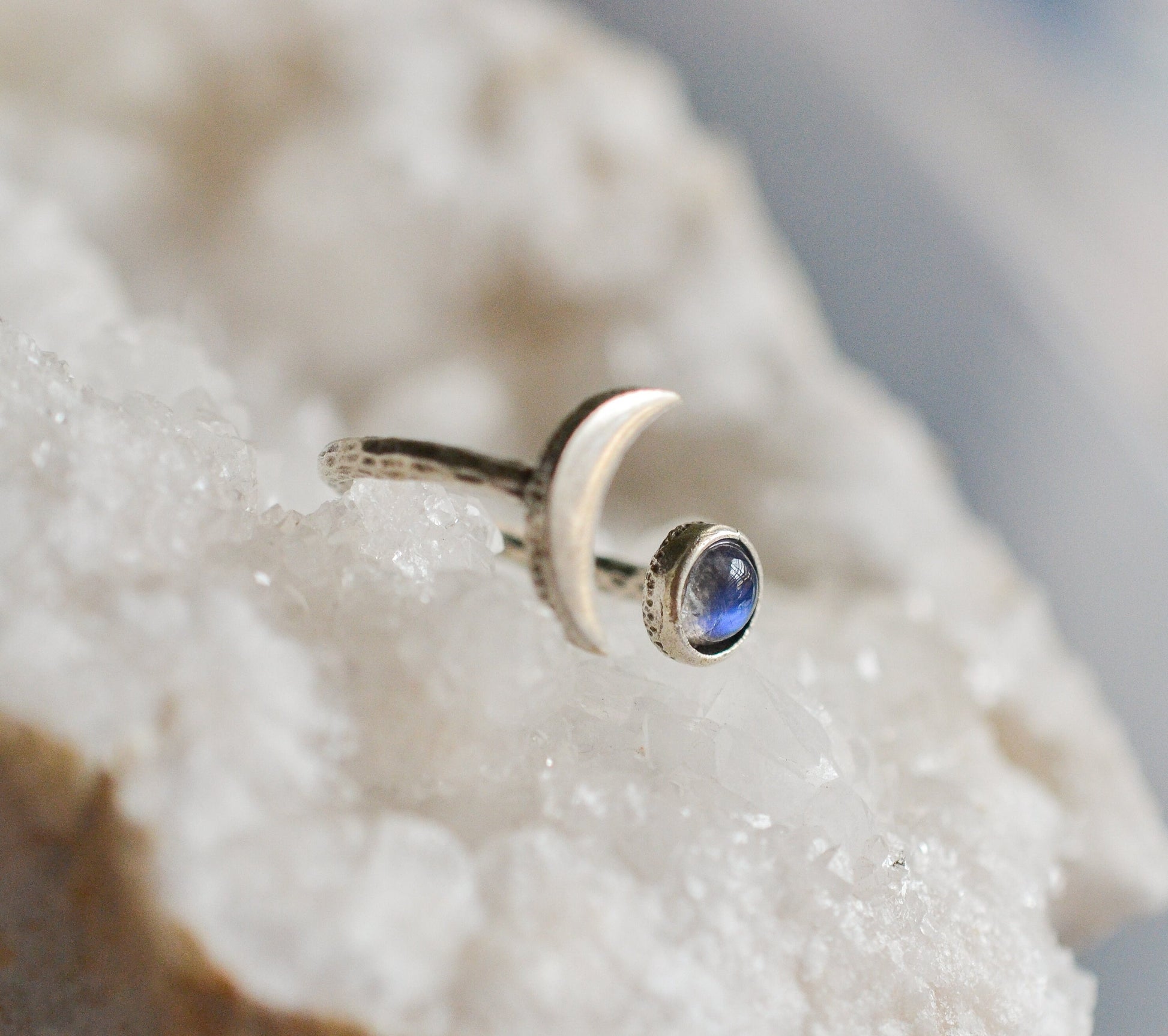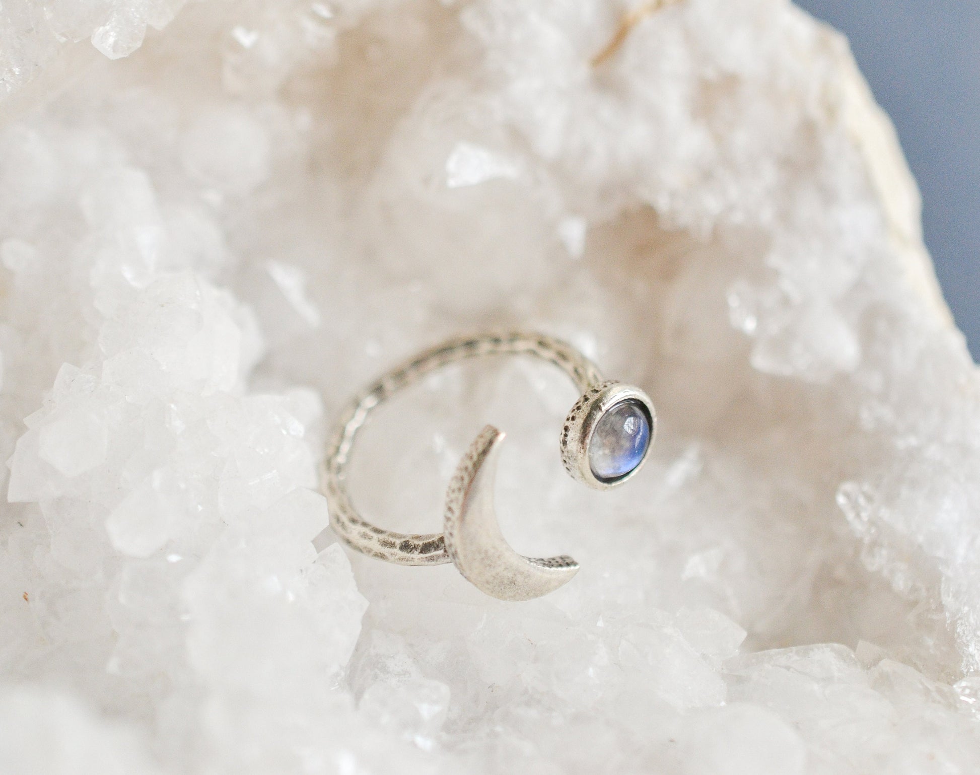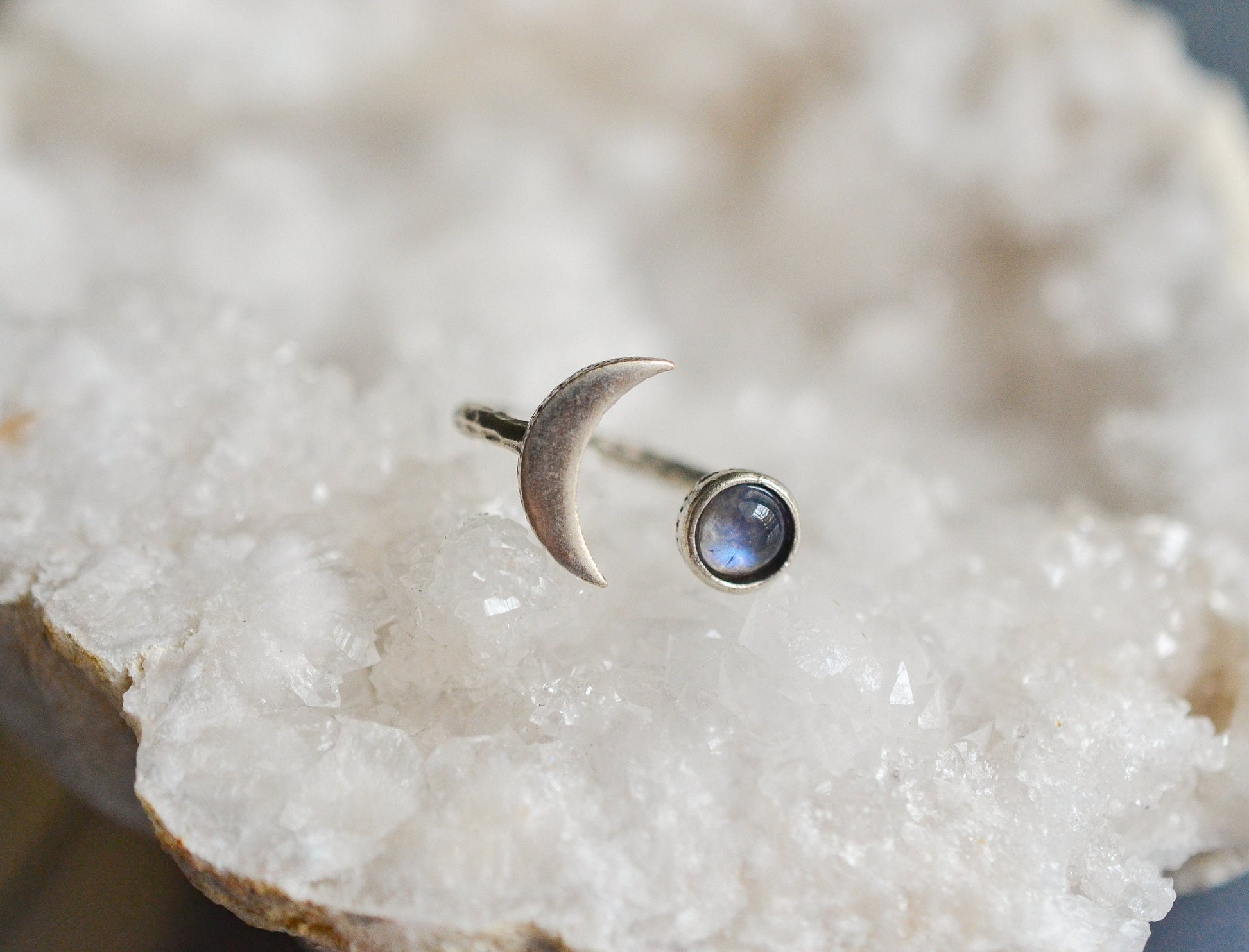 Beautiful celestial ring featuring a crescent moon and a flashy moonstone all attached to an adjustable hammered ring.