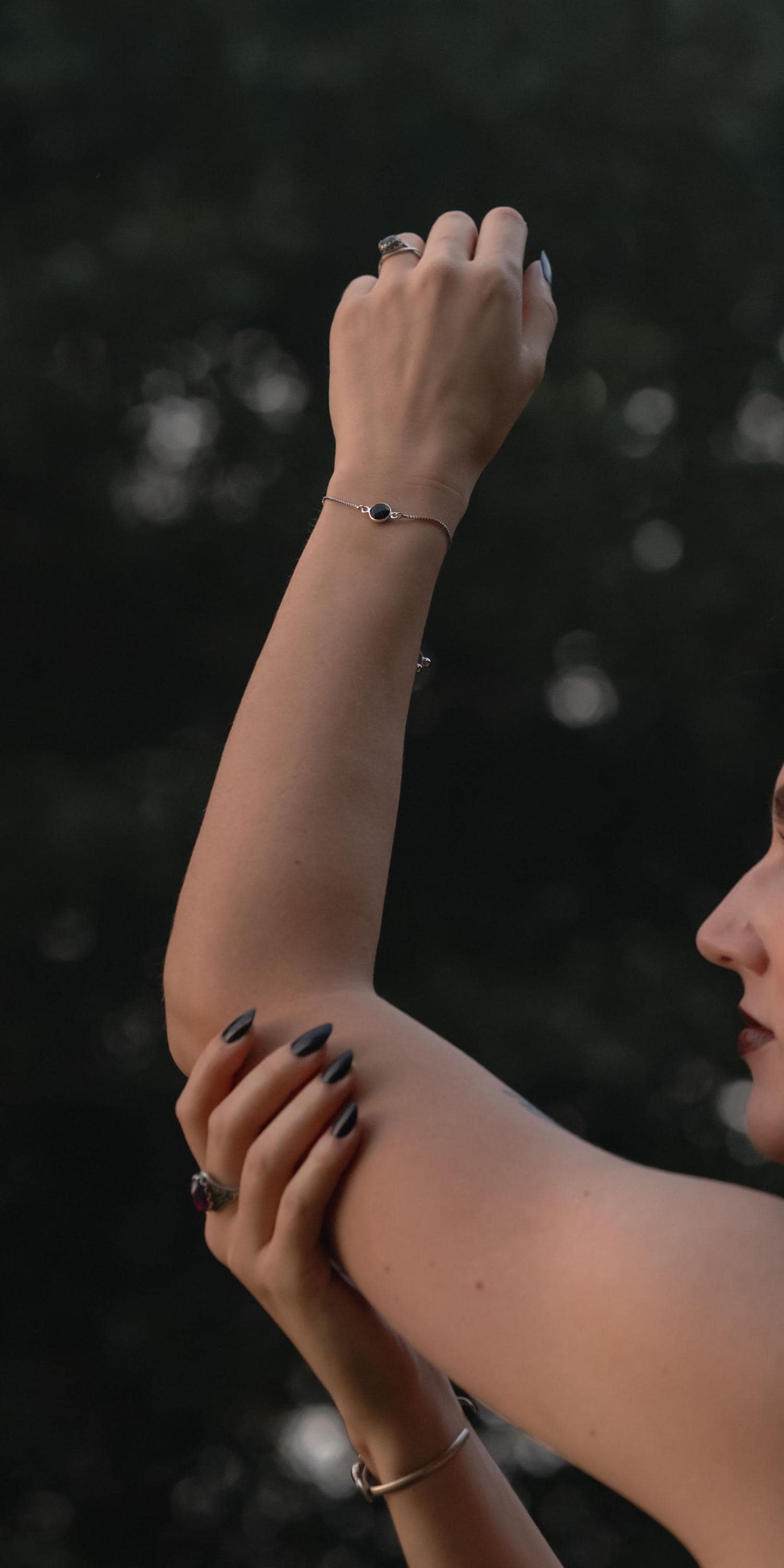Created with a silver plated 8mm onyx connector that is attached to a dainty rhodium plated chain and finished with a slider bead for a fully adjustable fit. Two silver ball ends complete the look.