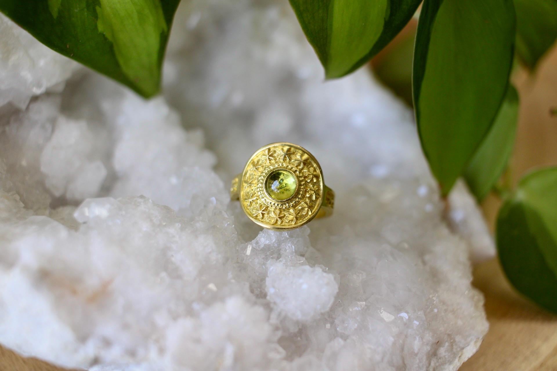 This boho gemstone statement ring features a beautiful green peridot set at the center of a star textured design. The celestial pattern continues along the adjustable band