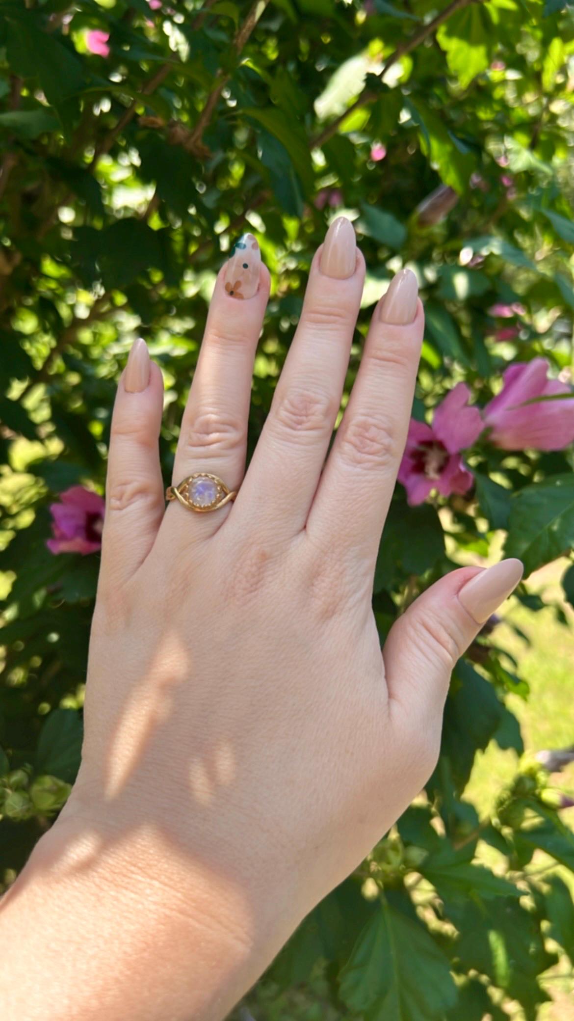 This boho style moonstone ring features an 8mm round rainbow moonstone set in a delicate crown bezel on a brass adjustable band.