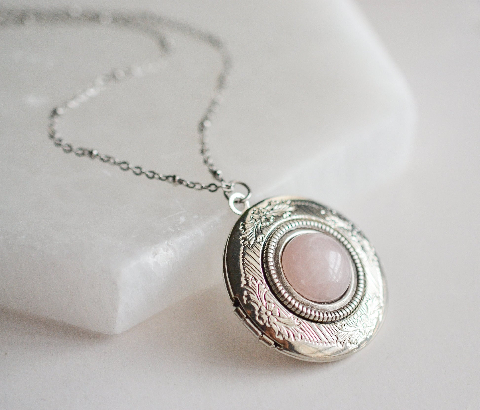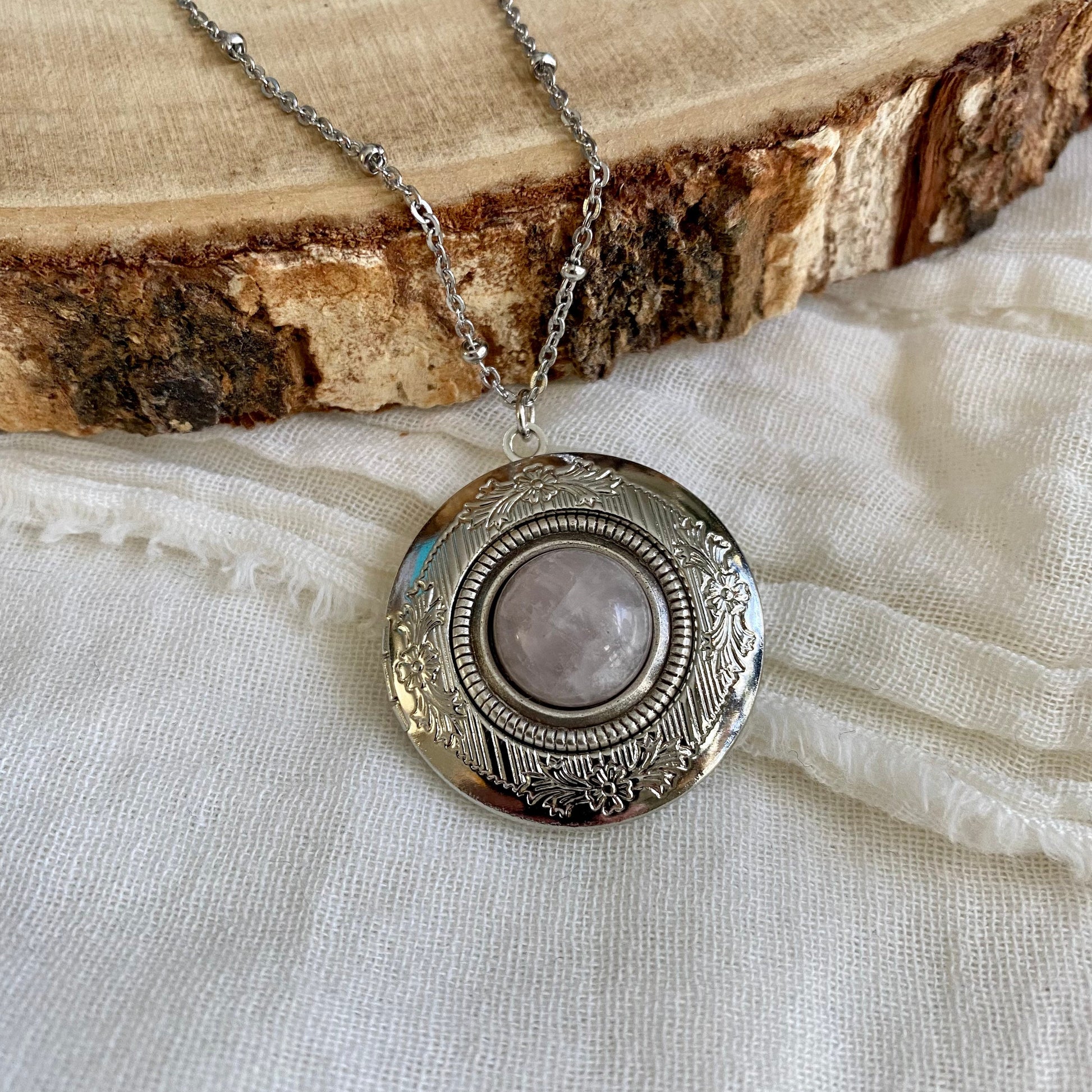 Gemstone locket necklace featuring a 32mm photo locket adorned with a 13mm genuine rose quartz cabochon. They hang from an 18" dainty stainless steel satellite chain necklace.